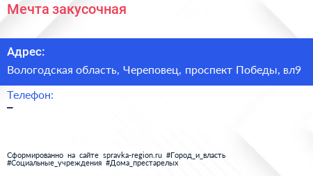 Мечта, закусочная по адресу Вологодская область, Череповец, проспект Победы, вл9 в дальнейшем Организация, размещена в следующих категориях: