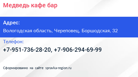 Медведь, кафе-бар по адресу Вологодская область, Череповец, Боршодская, 32 в дальнейшем Организация, размещена в следующих категориях: