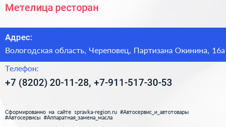 Метелица, ресторан по адресу Вологодская область, Череповец, Партизана Окинина, 16а в дальнейшем Организация, размещена в следующих категориях: