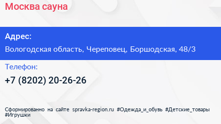Москва, сауна по адресу Вологодская область, Череповец, Боршодская, 48/3 в дальнейшем Организация, размещена в следующих категориях: