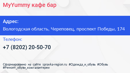 MyYummy, кафе-бар по адресу Вологодская область, Череповец, проспект Победы, 174 в дальнейшем Организация, размещена в следующих категориях:
