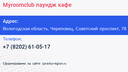 Myroomclub, лаундж-кафе по адресу Вологодская область, Череповец, Советский проспект, 78 в дальнейшем Организация, размещена в следующих категориях: