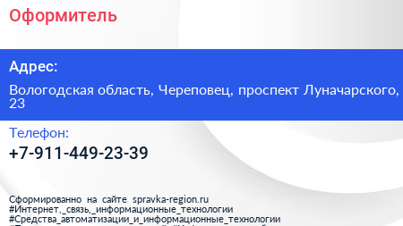 Оформитель по адресу Вологодская область, Череповец, проспект Луначарского, 23 в дальнейшем Организация, размещена в следующих категориях: