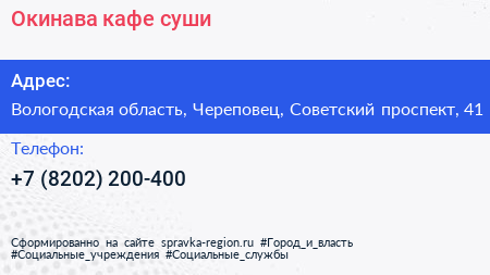 Окинава, кафе суши по адресу Вологодская область, Череповец, Советский проспект, 41 в дальнейшем Организация, размещена в следующих категориях: