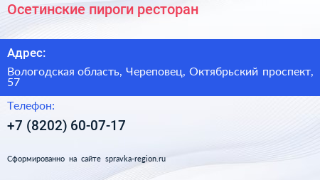 Осетинские пироги, ресторан по адресу Вологодская область, Череповец, Октябрьский проспект, 57 в дальнейшем Организация, размещена в следующих категориях: