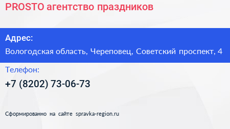 PROSTO, агентство праздников по адресу Вологодская область, Череповец, Советский проспект, 4 в дальнейшем Организация, размещена в следующих категориях: