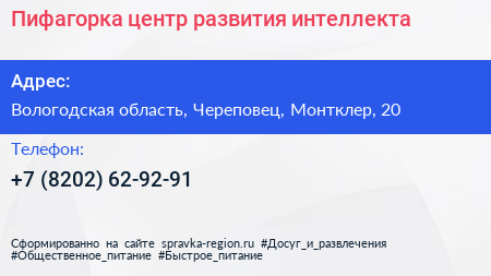 Пифагорка, центр развития интеллекта по адресу Вологодская область, Череповец, Монтклер, 20 в дальнейшем Организация, размещена в следующих категориях:
