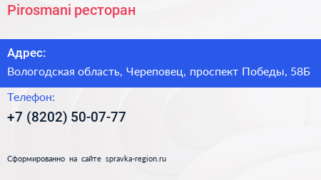 Pirosmani, ресторан по адресу Вологодская область, Череповец, проспект Победы, 58Б в дальнейшем Организация, размещена в следующих категориях: