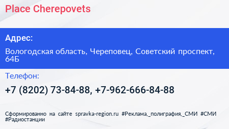 Place Cherepovets по адресу Вологодская область, Череповец, Советский проспект, 64Б в дальнейшем Организация, размещена в следующих категориях: