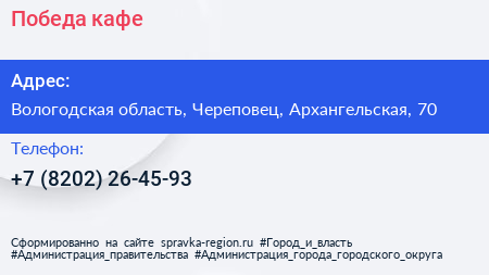 Победа, кафе по адресу Вологодская область, Череповец, Архангельская, 70 в дальнейшем Организация, размещена в следующих категориях: