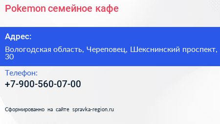 Pokemon, семейное кафе по адресу Вологодская область, Череповец, Шекснинский проспект, 30 в дальнейшем Организация, размещена в следующих категориях: