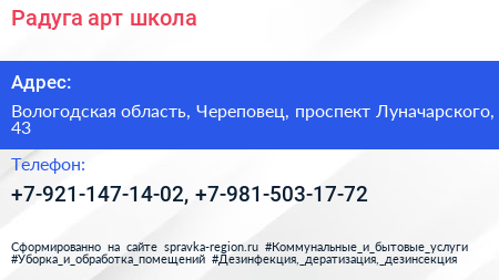 Радуга, арт-школа по адресу Вологодская область, Череповец, проспект Луначарского, 43 в дальнейшем Организация, размещена в следующих категориях: