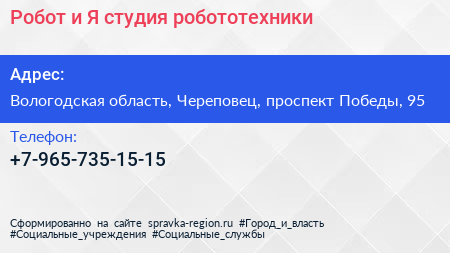 Робот и Я, студия робототехники по адресу Вологодская область, Череповец, проспект Победы, 95 в дальнейшем Организация, размещена в следующих категориях: