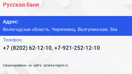 Русская баня по адресу Вологодская область, Череповец, Волгучинская, 36а в дальнейшем Организация, размещена в следующих категориях: