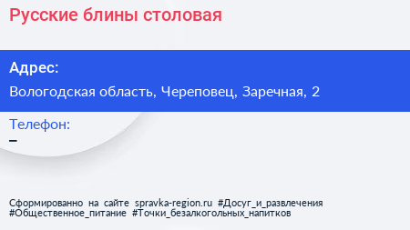 Русские блины, столовая по адресу Вологодская область, Череповец, Заречная, 2 в дальнейшем Организация, размещена в следующих категориях: