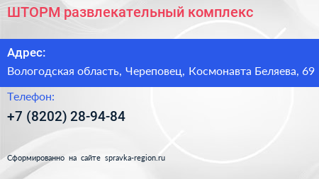 ШТОРМ, развлекательный комплекс по адресу Вологодская область, Череповец, Космонавта Беляева, 69 в дальнейшем Организация, размещена в следующих категориях: