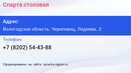 Спарта, столовая по адресу Вологодская область, Череповец, Леднева, 2 в дальнейшем Организация, размещена в следующих категориях: