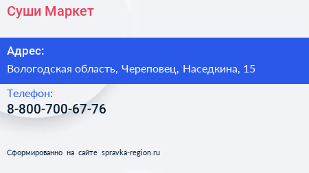 Суши-Маркет по адресу Вологодская область, Череповец, Наседкина, 15 в дальнейшем Организация, размещена в следующих категориях: