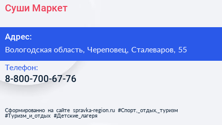Суши-Маркет по адресу Вологодская область, Череповец, Сталеваров, 55 в дальнейшем Организация, размещена в следующих категориях: