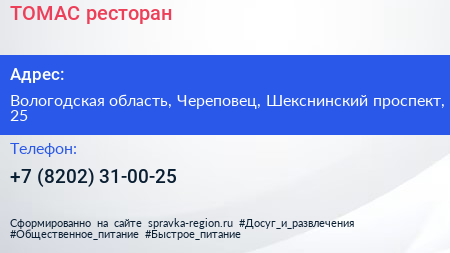 ТОМАС, ресторан по адресу Вологодская область, Череповец, Шекснинский проспект, 25 в дальнейшем Организация, размещена в следующих категориях: