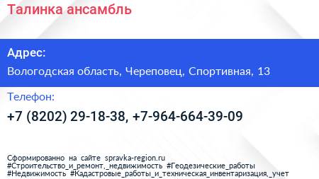 Талинка, ансамбль по адресу Вологодская область, Череповец, Спортивная, 13 в дальнейшем Организация, размещена в следующих категориях: