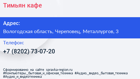 Тимьян, кафе по адресу Вологодская область, Череповец, Металлургов, 3 в дальнейшем Организация, размещена в следующих категориях: