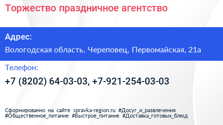 Торжество, праздничное агентство по адресу Вологодская область, Череповец, Первомайская, 21а в дальнейшем Организация, размещена в следующих категориях: