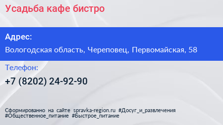 Усадьба, кафе-бистро по адресу Вологодская область, Череповец, Первомайская, 58 в дальнейшем Организация, размещена в следующих категориях: