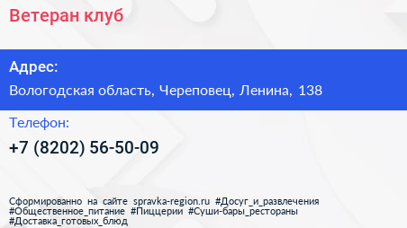 Ветеран, клуб по адресу Вологодская область, Череповец, Ленина, 138 в дальнейшем Организация, размещена в следующих категориях: