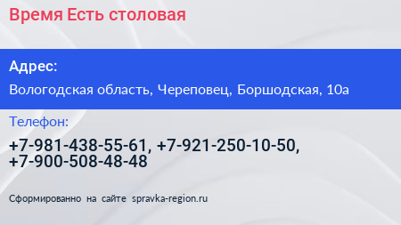 Время Есть, столовая по адресу Вологодская область, Череповец, Боршодская, 10а в дальнейшем Организация, размещена в следующих категориях: