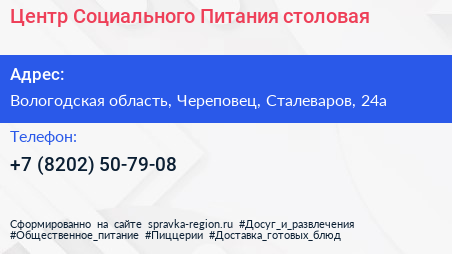 Центр Социального Питания, столовая по адресу Вологодская область, Череповец, Сталеваров, 24а в дальнейшем Организация, размещена в следующих категориях: