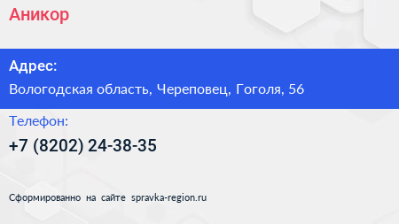 Аникор+ по адресу Вологодская область, Череповец, Гоголя, 56 в дальнейшем Организация, размещена в следующих категориях: