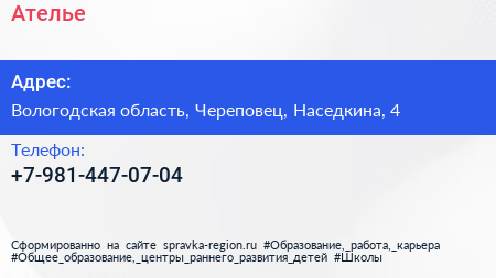 Ателье по адресу Вологодская область, Череповец, Наседкина, 4 в дальнейшем Организация, размещена в следующих категориях: