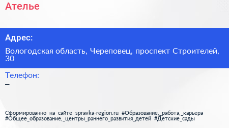 Ателье по адресу Вологодская область, Череповец, проспект Строителей, 30 в дальнейшем Организация, размещена в следующих категориях: