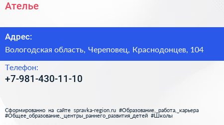 Ателье по адресу Вологодская область, Череповец, Краснодонцев, 104 в дальнейшем Организация, размещена в следующих категориях: