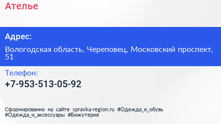 Ателье по адресу Вологодская область, Череповец, Московский проспект, 51 в дальнейшем Организация, размещена в следующих категориях: