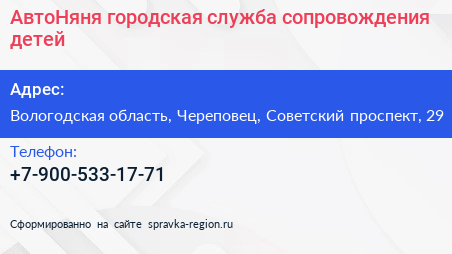 АвтоНяня, городская служба сопровождения детей по адресу Вологодская область, Череповец, Советский проспект, 29 в дальнейшем Организация, размещена в следующих категориях: