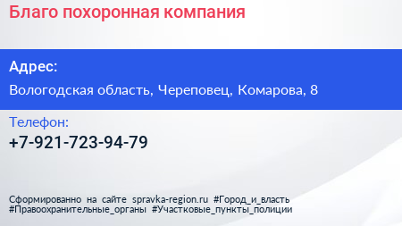 Благо, похоронная компания по адресу Вологодская область, Череповец, Комарова, 8 в дальнейшем Организация, размещена в следующих категориях: