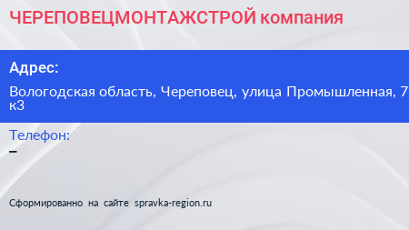 ЧЕРЕПОВЕЦМОНТАЖСТРОЙ, компания по адресу Вологодская область, Череповец, улица Промышленная, 7 к3 в дальнейшем Организация, размещена в следующих категориях: