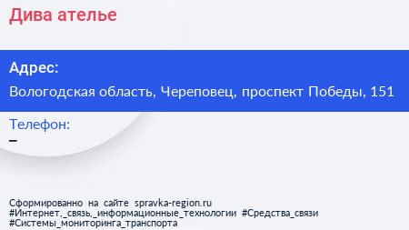 Дива, ателье по адресу Вологодская область, Череповец, проспект Победы, 151 в дальнейшем Организация, размещена в следующих категориях: