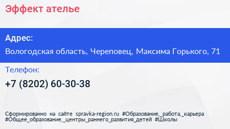 Эффект, ателье по адресу Вологодская область, Череповец, Максима Горького, 71 в дальнейшем Организация, размещена в следующих категориях: