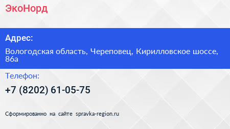 ЭкоНорд по адресу Вологодская область, Череповец, Кирилловское шоссе, 86а в дальнейшем Организация, размещена в следующих категориях: