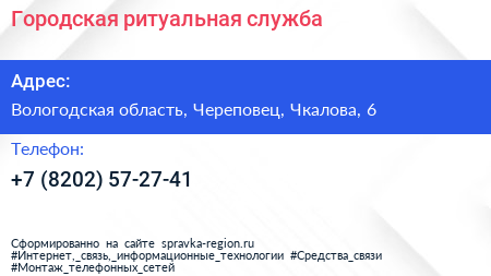 Городская ритуальная служба по адресу Вологодская область, Череповец, Чкалова, 6 в дальнейшем Организация, размещена в следующих категориях: