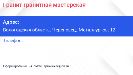 Гранит, гранитная мастерская по адресу Вологодская область, Череповец, Металлургов, 12 в дальнейшем Организация, размещена в следующих категориях: