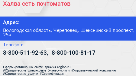 Халва, сеть почтоматов по адресу Вологодская область, Череповец, Шекснинский проспект, 25а в дальнейшем Организация, размещена в следующих категориях:
