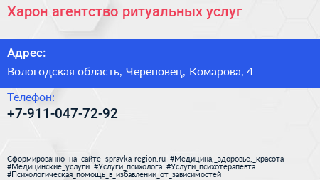 Харон, агентство ритуальных услуг по адресу Вологодская область, Череповец, Комарова, 4 в дальнейшем Организация, размещена в следующих категориях: