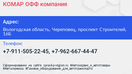 КОМАР - ОФФ, компания по адресу Вологодская область, Череповец, проспект Строителей, 16Б в дальнейшем Организация, размещена в следующих категориях: