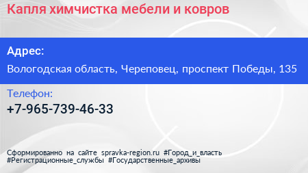Капля, химчистка мебели и ковров по адресу Вологодская область, Череповец, проспект Победы, 135 в дальнейшем Организация, размещена в следующих категориях: