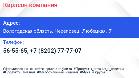 Карлсон, компания по адресу Вологодская область, Череповец, Любецкая, 7 в дальнейшем Организация, размещена в следующих категориях:
