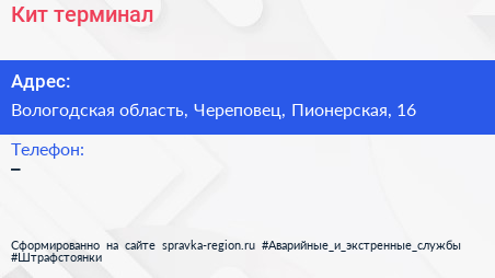 Кит, терминал по адресу Вологодская область, Череповец, Пионерская, 16 в дальнейшем Организация, размещена в следующих категориях: